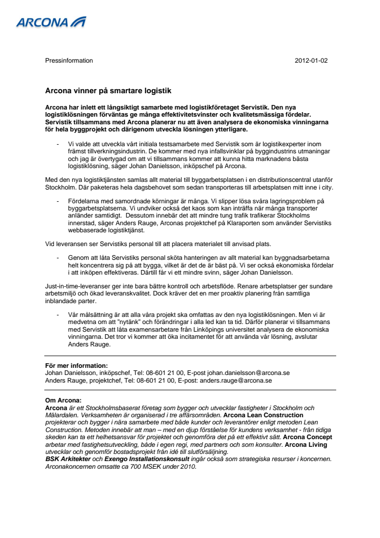 - Vi valde att utveckla vårt initiala testsamarbete med Servistik som är logistikexperter inom främst tillverkningsindustrin. De kommer med nya infallsvinklar på byggindustrins utmaningar och jag är övertygad om att vi tillsammans kommer att kunna hitta marknadens bästa logistiklösning, säger Johan Danielsson, inköpschef på Arcona.
