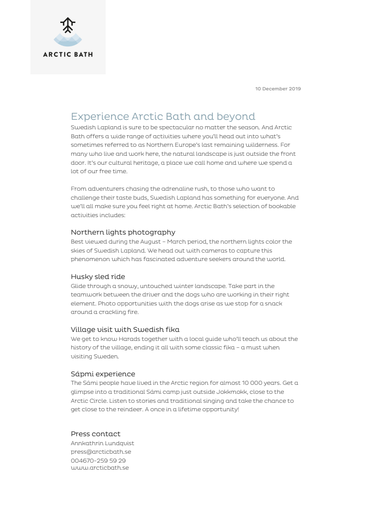 Presskontakt & PR Annkathrin Lundqvist press@arcticbath.se 070-2595929