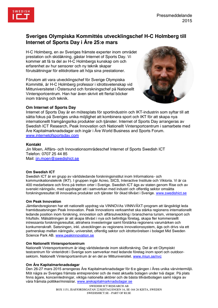 H-C Holmberg är utvecklingschef för Sveriges Olympiska Kommitté och är en av landets främsta experter inom prestation och skidåkning. H-C Holmberg är keynote speaker under Internet of Sports Day som arrangeras 25 mars i samband med Åre Kapitalmarknadsdagar.