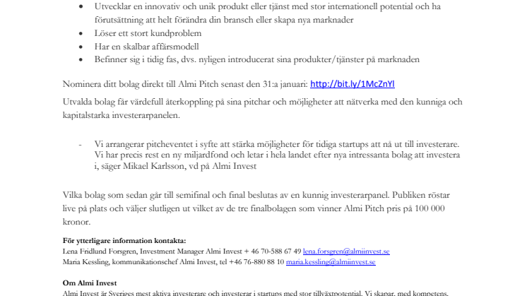 Nominera ditt bolag direkt till Almi Pitch senast den 31:a januari: Klicka här för att komma till Almi Pitch nominering