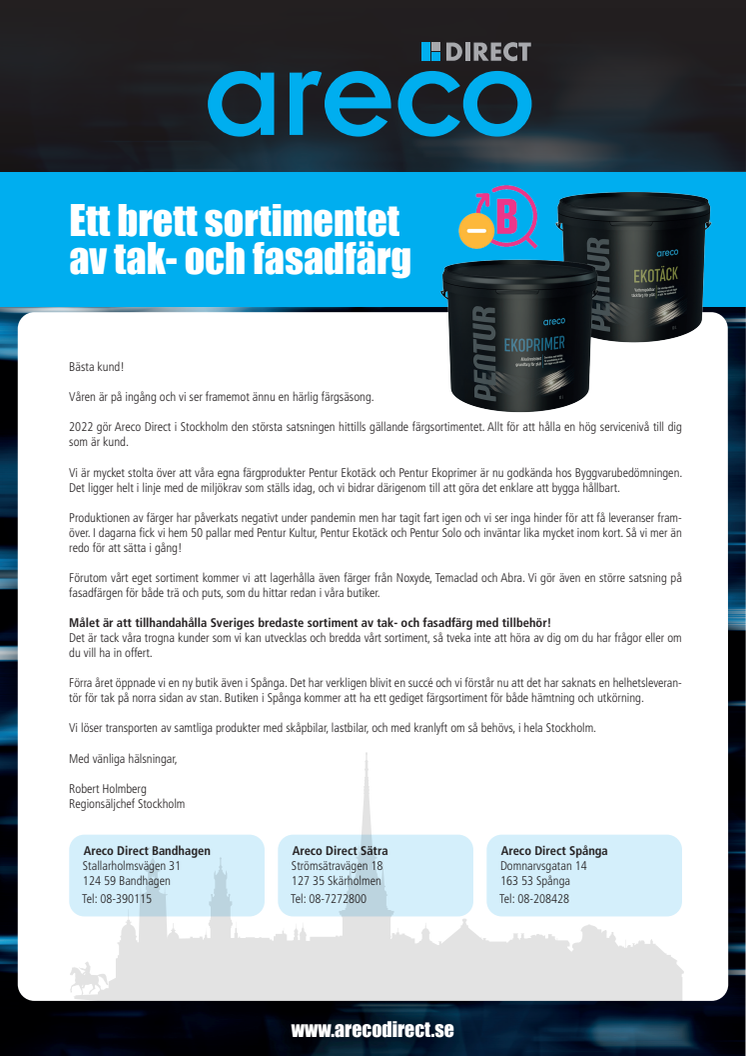 Våren är på ingång och vi ser framemot ännu en härlig färgsäsong. 2022 gör Areco Direct i Stockholm den största satsningen hittills gällande färgsortimentet. Våra egna färgprodukter Pentur Ekotäck och Pentur Ekoprimer är nu godkända hos Byggvarubedömningen. Det ligger helt i linje med de miljökrav som ställs idag, och vi bidrar därigenom till att göra det enklare att bygga hållbart.