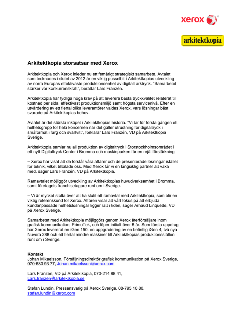 Arkitektkopia och Xerox inleder nu ett femårigt strategiskt samarbete. Avtalet som tecknades i slutet av 2012 är en viktig pusselbit i Arkitektkopias utveckling av norra Europas effektivaste produktionsenhet av digitalt arktryck. ”Samarbetet stärker vår konkurrenskraft”, berättar Lars Franzén.