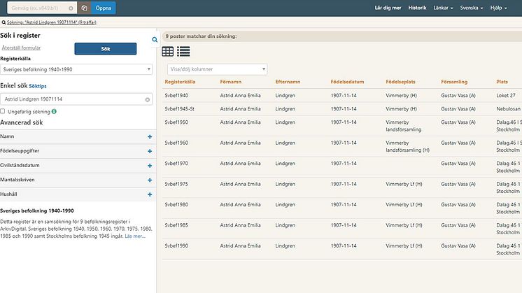 ArkivDigital har just lanserat Sveriges befolkning 1940-1990 som gör det ännu enklare att söka efter dina släktingar och förfäder i våra register. I stället för att göra separata sökningar i våra olika befolkningsregister kan du nu med en enda sökning få ett träffresultat som inkluderar poster från upp till nio olika register.