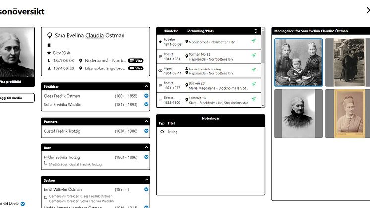 Den här veckan har vi gjort två stora uppdateringar av ArkivDigitals släktträd. Vi har lagt till en personöversikt samt möjligheten att lägga in fler bilder i trädet. I samband med dessa båda uppdateringar har vi även tagit bort släktträdets betastämpel.