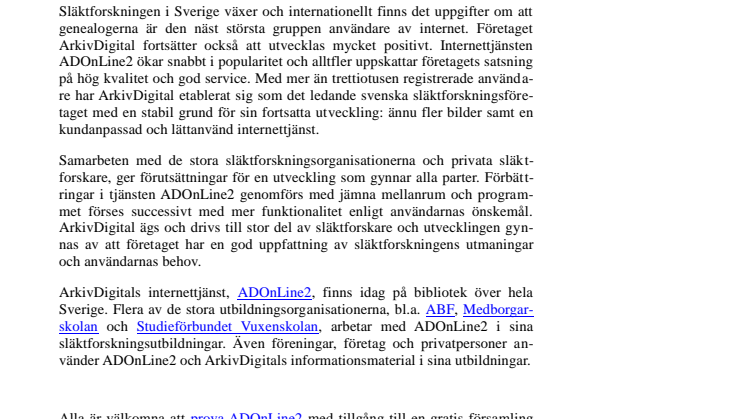 Släktforskningen i Sverige växer och internationellt finns det uppgifter om att genealogerna är den näst största gruppen användare av internet. Företaget ArkivDigital fortsätter också att utvecklas mycket positivt. Internettjänsten ADOnLine2 ökar snabbt i popularitet och alltfler uppskattar företagets satsning på hög kvalitet och god service. Med mer än trettiotusen registrerade användare har ArkivDigital etablerat sig som det ledande svenska släktforskningsföretaget med en stabil grund för sin fortsatta utveckling: ännu fler bilder samt en kundanpassad och lättanvänd internettjänst.