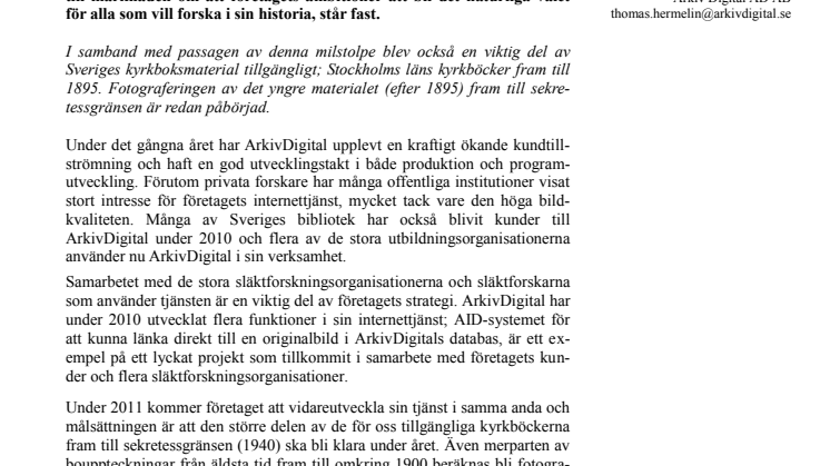 Under det gångna året har ArkivDigital upplevt en kraftigt ökande kundtillströmning och haft en god utvecklingstakt i både produktion och programutveckling. Förutom privata forskare har många offentliga institutioner visat stort intresse för företagets internettjänst, mycket tack vare den höga bildkvaliteten. Många av Sveriges bibliotek har också blivit kunder till ArkivDigital under 2010 och flera av de stora utbildningsorganisationerna använder nu ArkivDigital i sin verksamhet.