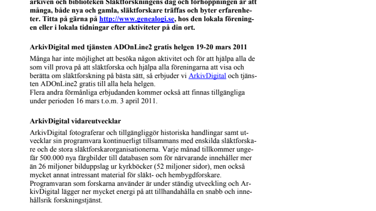 ArkivDigital och ADOnLine2 gratis helgen 19-20 mars 2011