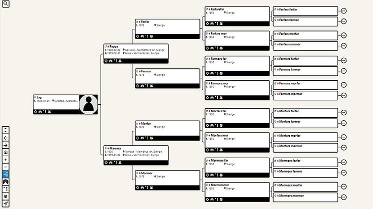 - Fyra generationer kan visas i antavlevyn utöver den person som är fokusperson och texten syns tydligt i alla generationer.