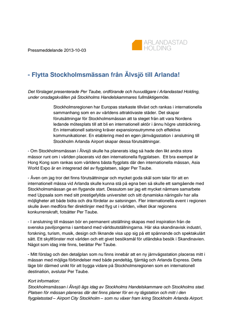 Flytta Stockholmsmässan från Älvsjö till Arlanda! En internationell satsning kräver expansionsutrymme och effektiva kommunikationer. En etablering med en egen järnvägsstation i anslutning till Stockholm Arlanda Airport skapar dessa förutsättningar. Detta förslag presenterade Per Taube, styrelseordförande i Arlandastad Holding AB, vid Handelskammarens fullmäktigemöte onsdagen 2 oktober.