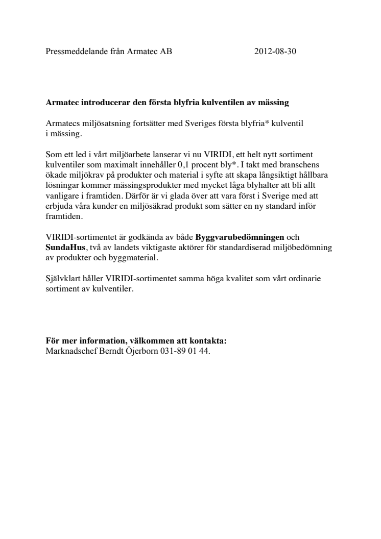 Armatecs miljösatsning fortsätter med Sveriges första blyfria* kulventil i mässing.