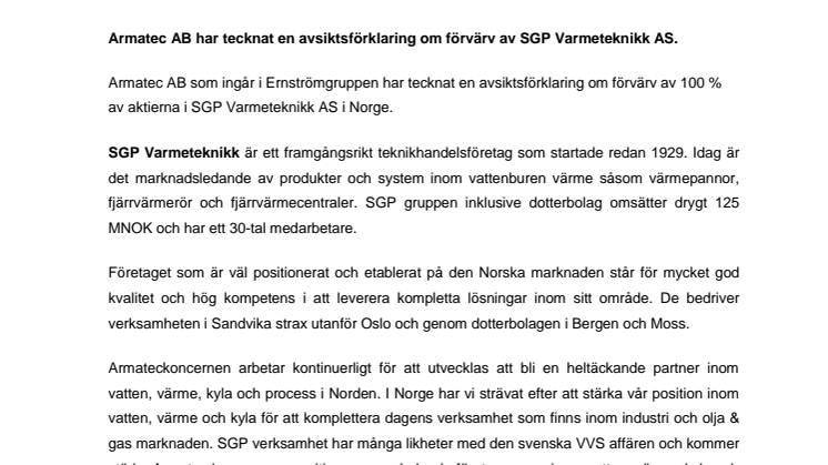 Armatec AB som ingår i Ernströmgruppen har tecknat en avsiktsförklaring om förvärv av 100 % av aktierna i SGP Varmeteknikk AS i Norge.
