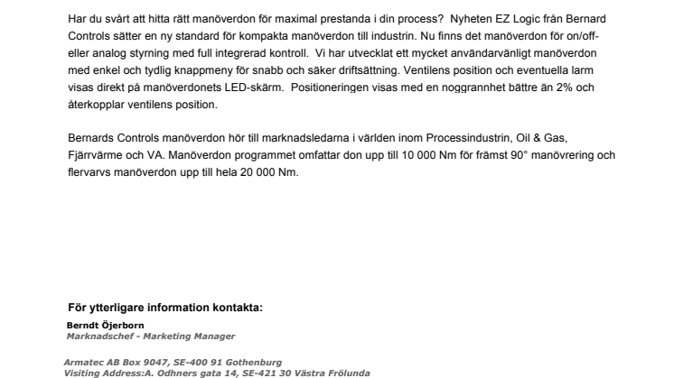 Bernards Controls manöverdon hör till marknadsledarna i världen inom Processindustrin, Oil & Gas, Fjärrvärme och VA. Manöverdon programmet omfattar don upp till 10 000 Nm för främst 90° manövrering och flervarvs manöverdon upp till hela 20 000 Nm.