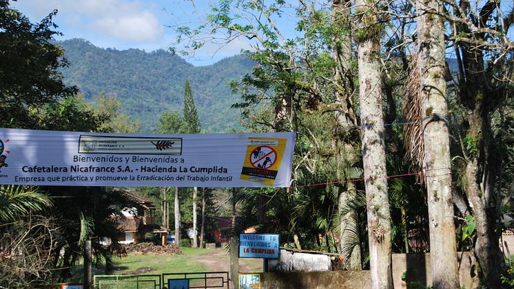 Kaffefarmen La Cumplida är stor – mycket större än vad jag trott, bara vägnätet på farmen är drygt 7 mil. Förutom kaffe odlar de även kakao och ormbunkar som används i buketter, en stor exportvara till Europa. När vi kör in genom farmen möts vi av en skylt som visar att man tar avstånd från barnarbete. Inte en självklarhet vare sig i Nicaragua eller i andra kaffeodlande länder.