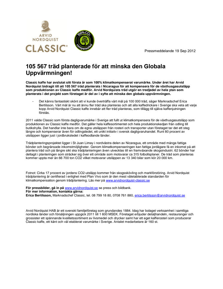 Classic kaffe har avslutat sitt första år som 100% klimatkompenserat varumärke. Under året har Arvid Nordquist bidragit till att 105 567 träd planterats i Nicaragua som kompenserar för de växthusgasutsläpp som produktionen av Classic kaffe medför. Arvid Nordquists träd utgör en tredjedel av hela ytan som planterats i det projekt som företaget är del av i syfte att minska den globala uppvärmningen.