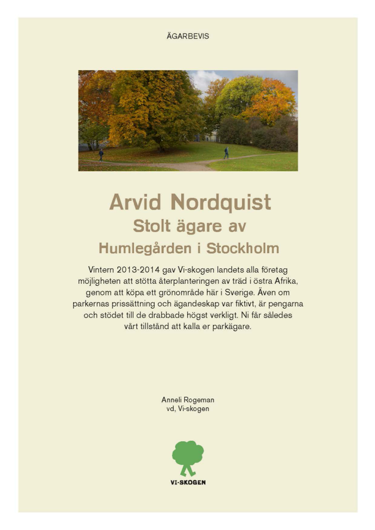 Vintern 2013-2014 gav Vi-skogen landets alla företag möjligheten att stötta återplanteringen av träd i östra Afrika, genom att köpa ett grönområde här i Sverige. Även om parkernas prissättning och ägandeskap var fiktivt, är pengarna och stödet till de drabbade högst verkligt.