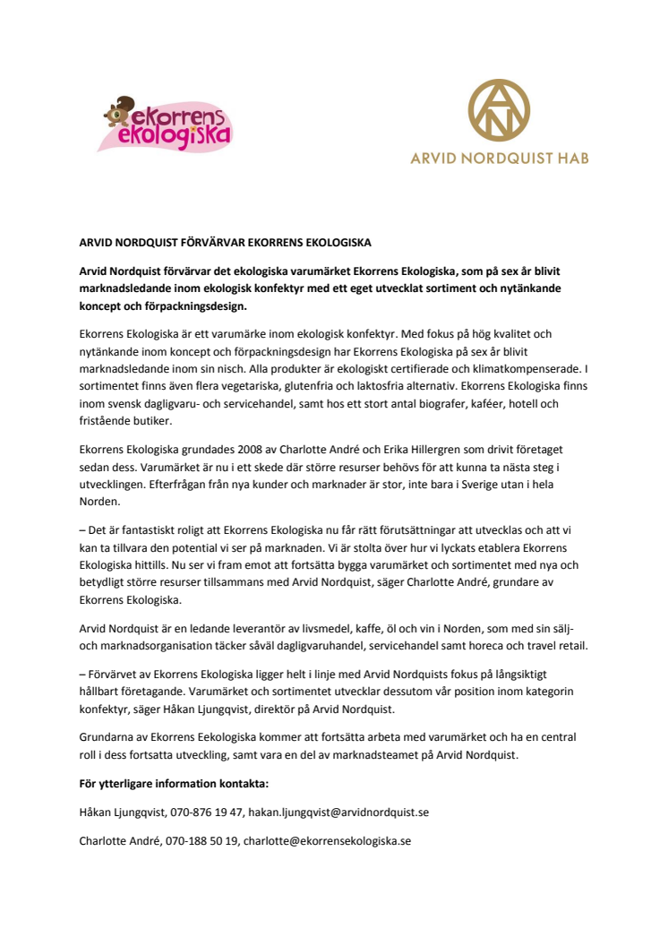 Arvid Nordquist förvärvar det ekologiska varumärket Ekorrens Ekologiska, som på sex år blivit marknadsledande inom ekologisk konfektyr med ett eget utvecklat sortiment och nytänkande koncept och förpackningsdesign.