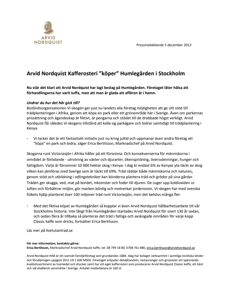 Arvid Nordquist Kafferosteri ”köper” Humlegården i Stockholm