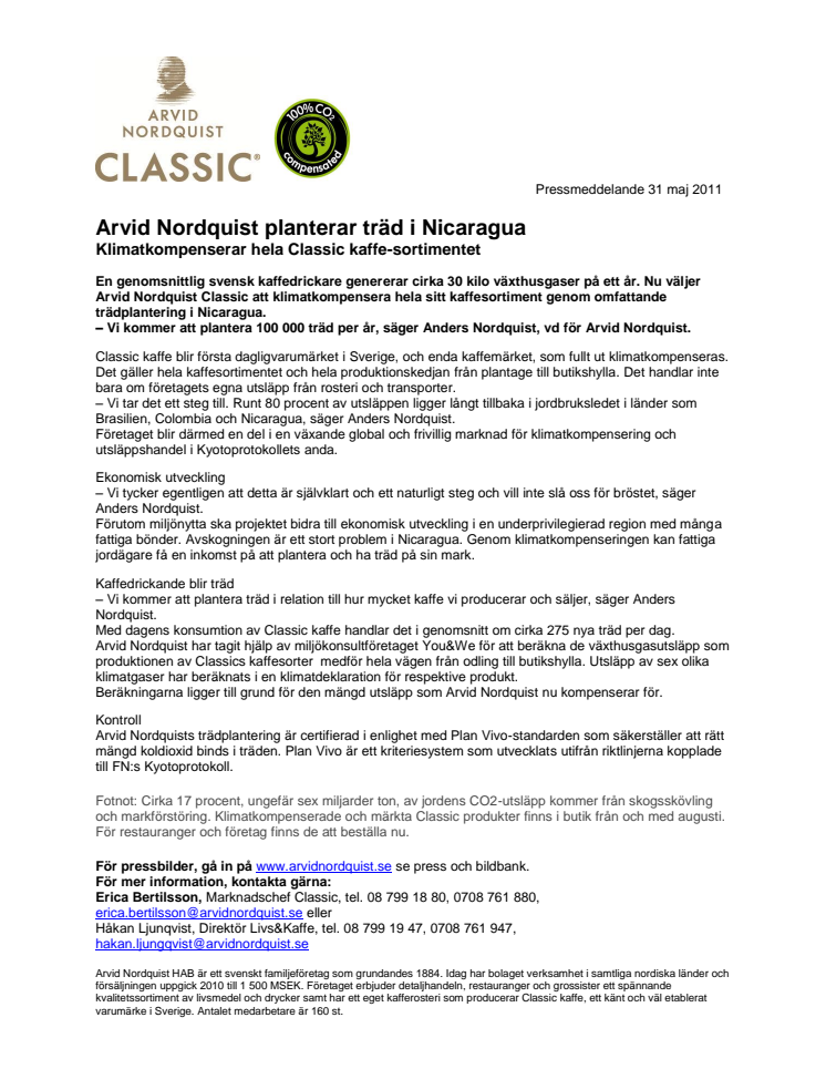 En genomsnittlig svensk kaffedrickare genererar cirka 30 kilo växthusgaser på ett år. Nu väljer Arvid Nordquist Classic att klimatkompensera hela sitt kaffesortiment genom omfattande trädplantering i Nicaragua.