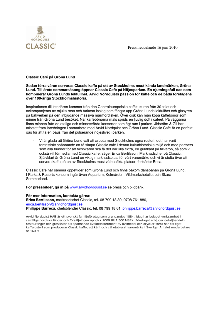 Sedan förra våren serveras Classic kaffe på ett av Stockholms mest kända landmärken, Gröna Lund. Till årets sommarsäsong öppnar Classic Café på Nöjesparken. En njutningsfull oas som kombinerar Gröna Lunds lekfullhet, Arvid Nordquists passion för kaffe och de båda företagens över 100-åriga Stockholmshistoria.