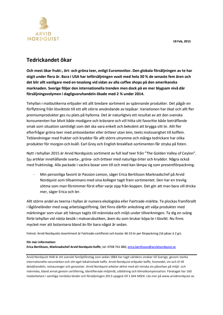 Och mest ökar frukt-, ört- och gröna teer, enligt Euromonitor. Den globala försäljningen av te har stigit under flera år. Bara i USA har teförsäljningen vuxit med hela 30 % de senaste fem åren. Sverige följer den internationella trenden men dock på en mer blygsam nivå där försäljningsvolymen i dagligvaruhandeln ökade med 2 % under 2014.