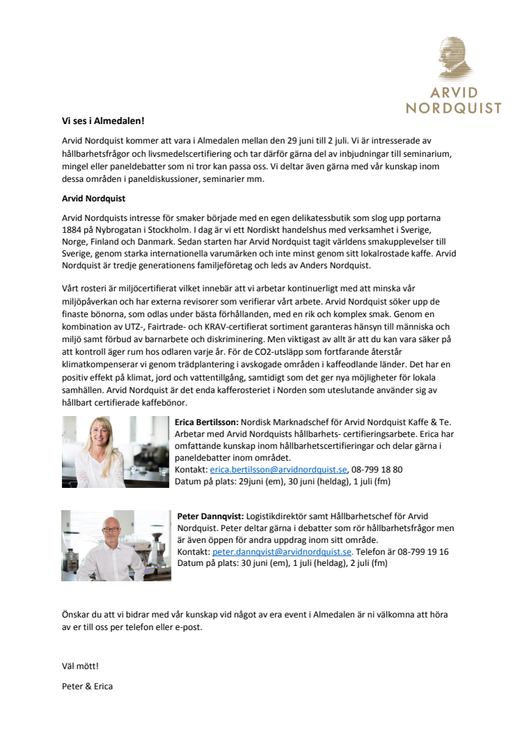 Arvid Nordquist kommer att vara i Almedalen mellan den 29 juni till 2 juli. Vi är intresserade av hållbarhetsfrågor och livsmedelscertifiering och tar därför gärna del av inbjudningar till seminarium, mingel eller paneldebatter som ni tror kan passa oss. Vi deltar även gärna med vår kunskap inom dessa områden i paneldiskussioner, seminarier mm.