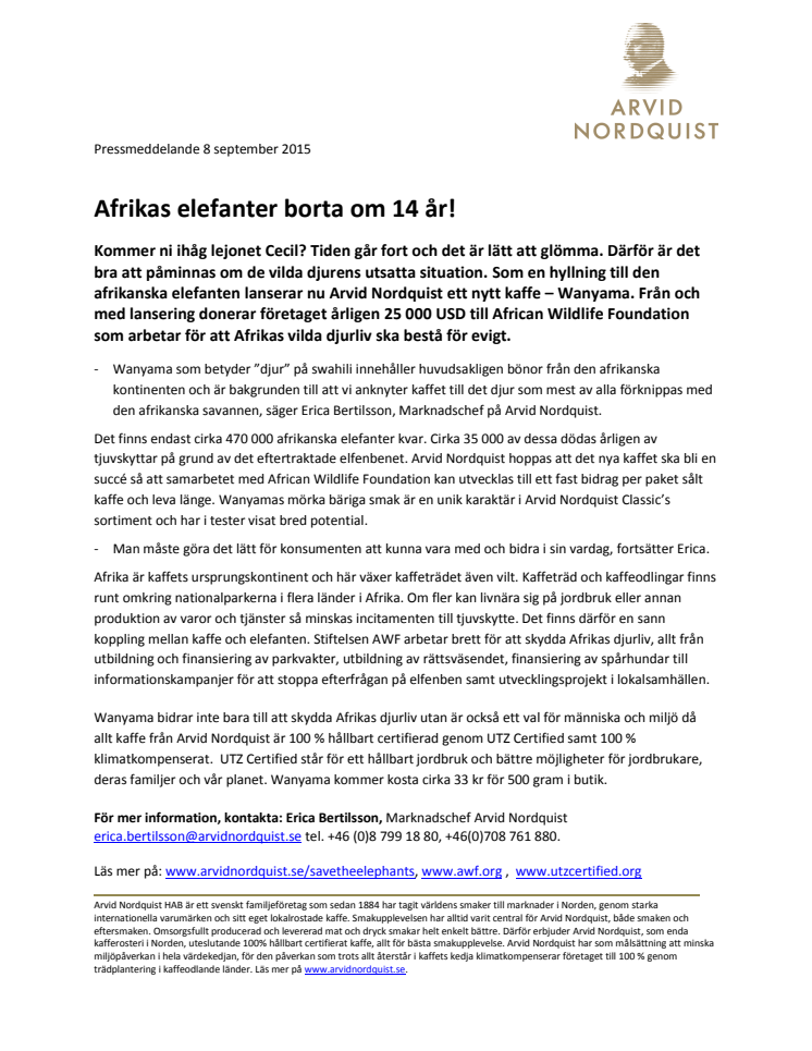 Kommer ni ihåg lejonet Cecil? Tiden går fort och det är lätt att glömma. Därför är det bra att påminnas om de vilda djurens utsatta situation. Som en hyllning till den afrikanska elefanten lanserar nu Arvid Nordquist ett nytt kaffe – Wanyama. Från och med lansering donerar företaget årligen 25 000 USD till African Wildlife Foundation som arbetar för att Afrikas vilda djurliv ska bestå för evigt.