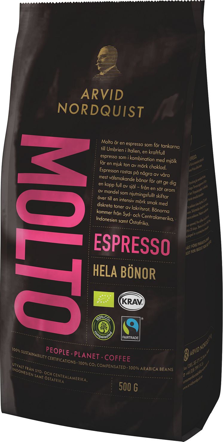 I en tid av ökad efterfrågan på ekologiskt kaffe väljer Arvid Nordquist att utöka sitt sortiment med Molto, en kraftfull espresso som för tankarna till Umbrien i Italien. Med ekologiska och Fairtrade-certifierade bönor passar Molto väl in i Arvid Nordquists hållbara sortiment. Bönorna i Molto kommer från Syd- och Centralamerika, Indonesien samt Östafrika och resultatet bli en smakrik fylligt rund espresso med toner av kakao och nöt.