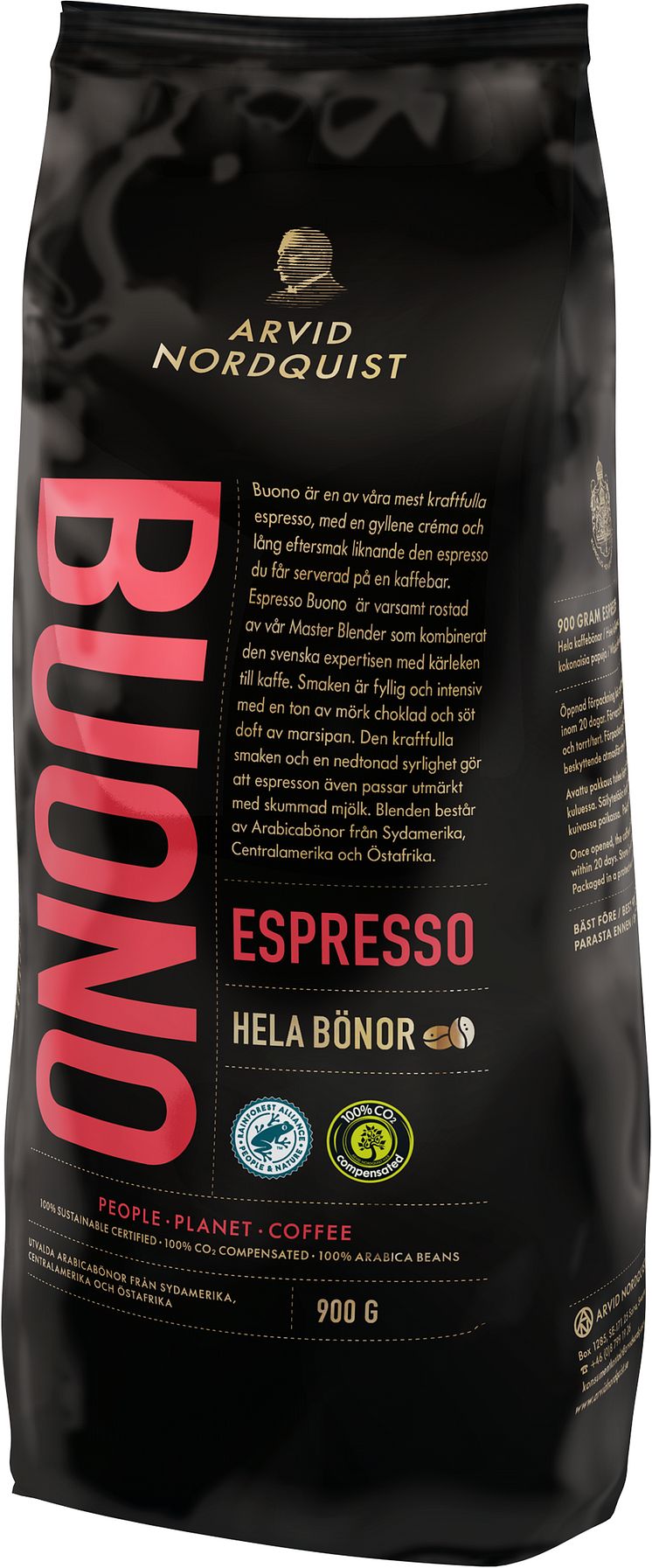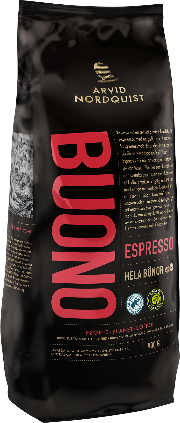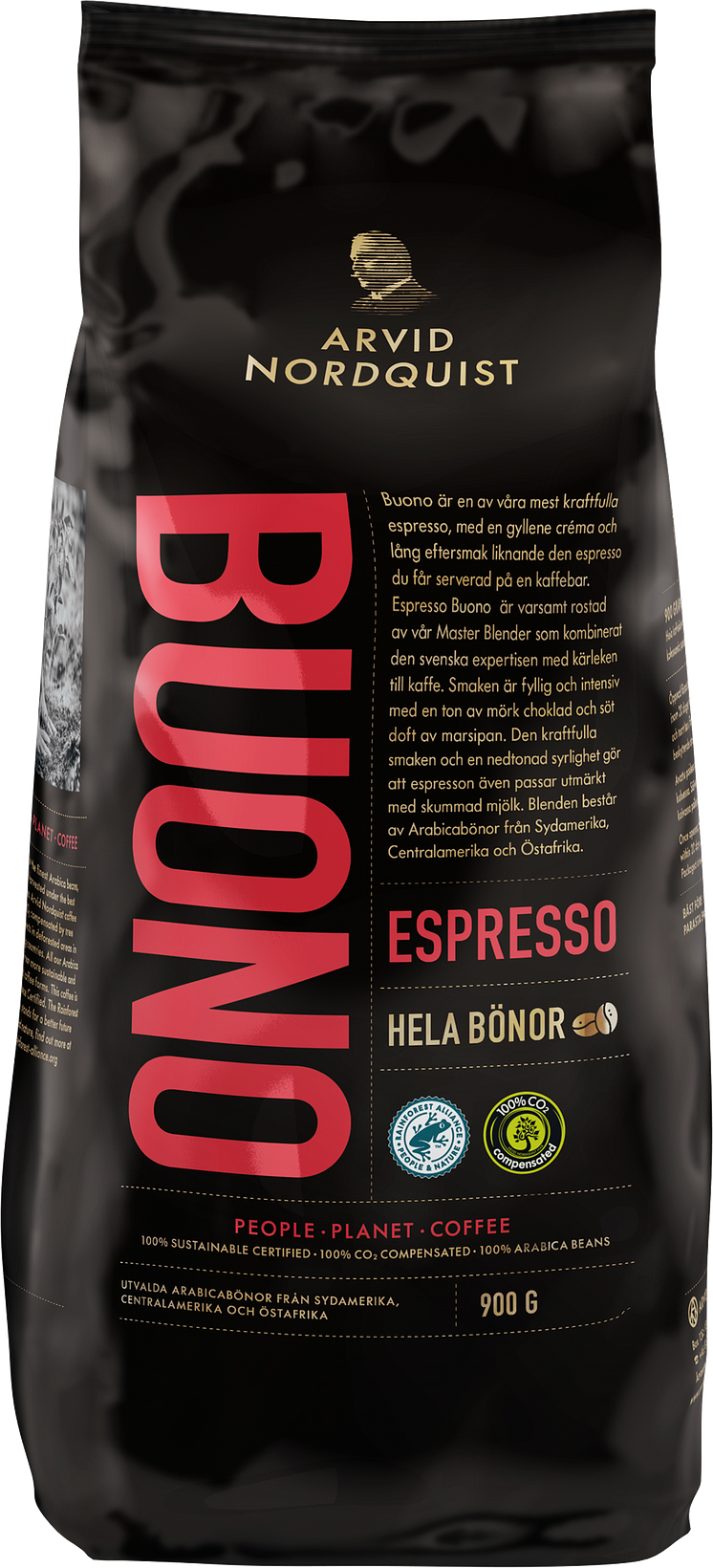 Arvid Nordquist utökar sitt Espresso-sortiment med nyheten Buono. Med en unik smakprofil bestående av 100% hållbart certifierade Arabicabönor från Sydamerika, Centralamerika och Östafrika, samt en större förpackning på 900g – kan du vara säker på att det goda kaffet räcker länge. Buono är ett kraftfullt och välbalanserat espressokaffe med smak av mörk choklad och söt doft av marsipan.