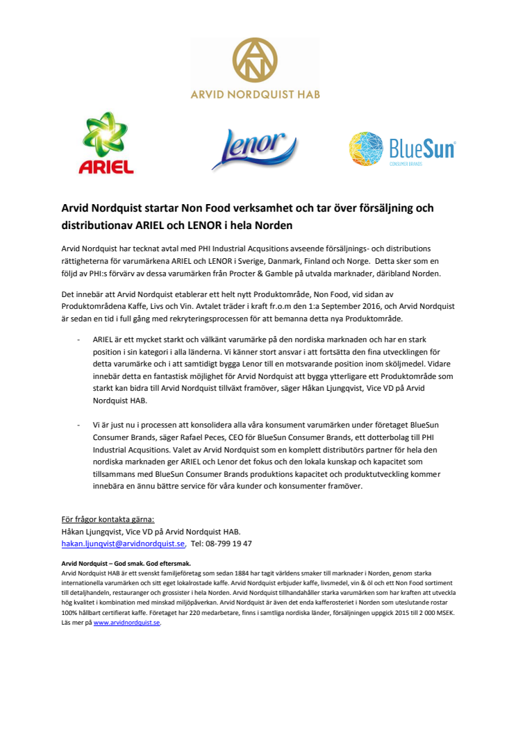 - -Vi är just nu i processen att konsolidera alla våra konsument varumärken under företaget BlueSun Consumer Brands, säger Rafael Peces, CEO för BlueSun Consumer Brands, ett dotterbolag till PHI Industrial Acqusitions. Valet av Arvid Nordquist som en komplett distributörs partner för hela den nordiska marknaden ger ARIEL och Lenor det fokus och den lokala kunskap och kapacitet som tillsammans med BlueSun Consumer Brands produktions kapacitet och produktutveckling kommer innebära en ännu bättre service för våra kunder och konsumenter framöver.