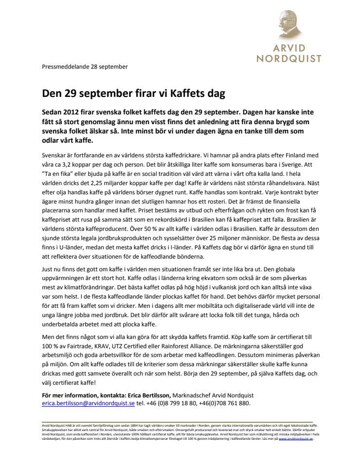 Sedan 2012 firar svenska folket kaffets dag den 29 september. Dagen har kanske inte fått så stort genomslag ännu men visst finns det anledning att fira denna brygd som svenska folket älskar så. Inte minst bör vi under dagen ägna en tanke till dem som odlar vårt kaffe.