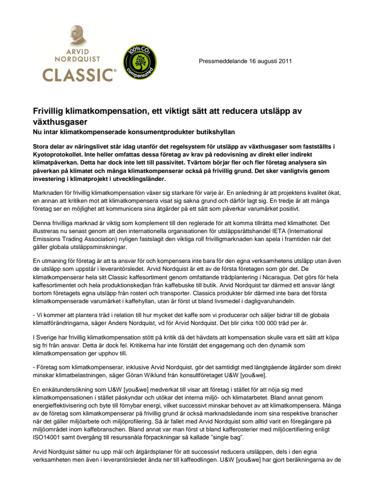 Arvid Nordquist sätter nu upp mål och åtgärdsplaner för att successivt reducera utsläppen, dels i den egna verksamheten men även i leverantörsledet ända ner till kaffeodlingen. U&W [you&we] har gjort beräkningarna av de växthusgasutsläpp som produktionen av Classics kaffesorter medför - hela vägen från produktion av gödsel via odling och transporter till butikshylla och det bildar underlag för beslut om reduktionsmål.