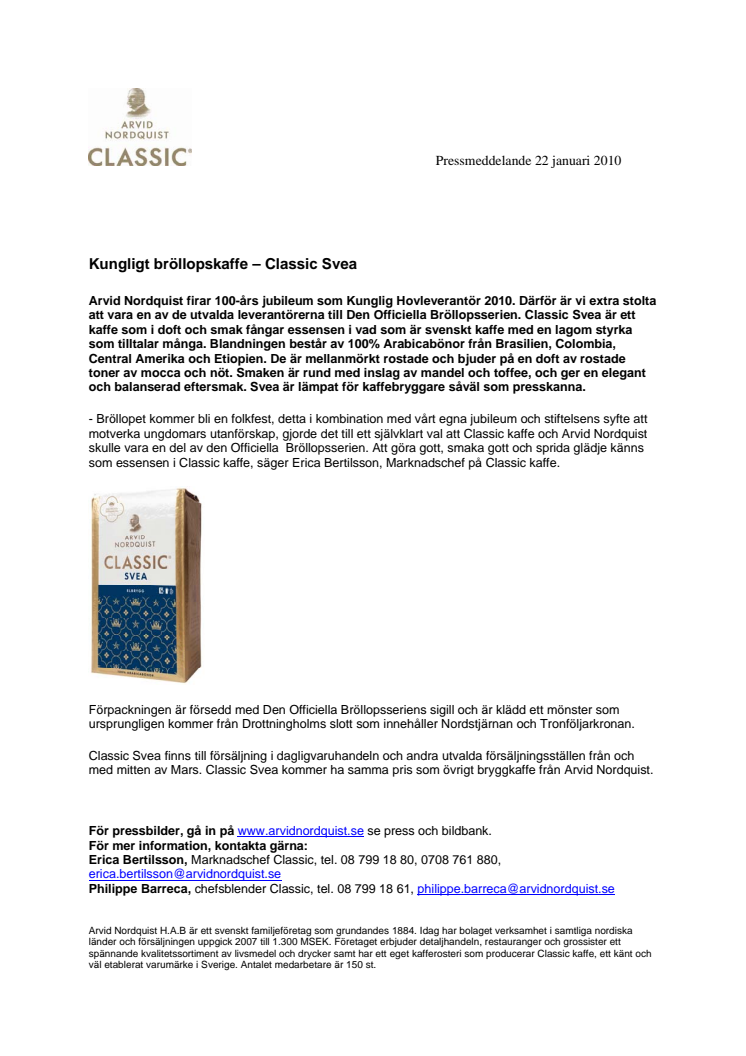 -Bröllopet kommer bli en folkfest, detta i kombination med vårt egna jubileum och stiftelsens syfte att motverka ungdomars utanförskap, gjorde det till ett självklart val att Classic kaffe och Arvid Nordquist skulle vara en del av Den Officiella Bröllopsserien. Att göra gott, smaka gott och sprida glädje känns som essensen i Classic kaffe, säger Erica Bertilsson, Marknadschef på Classic kaffe.