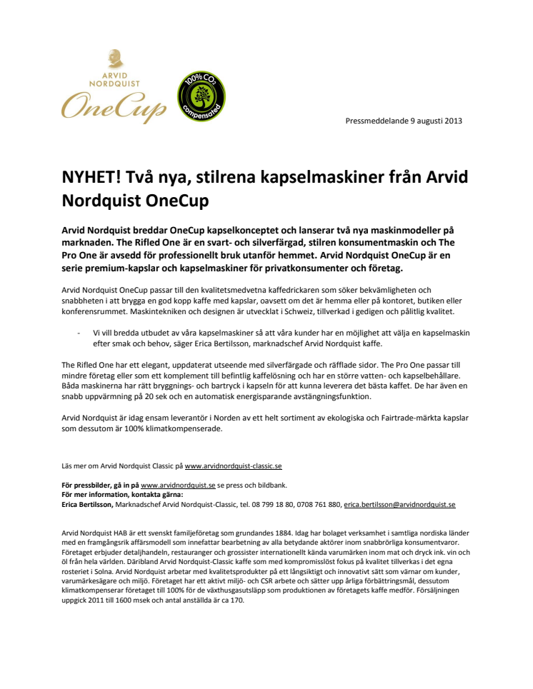 Arvid Nordquist breddar OneCup kapselkonceptet och lanserar två nya maskinmodeller på marknaden. The Rifled One är en svart- och silverfärgad, stilren konsumentmaskin och The Pro One är avsedd för professionellt bruk utanför hemmet. Arvid Nordquist OneCup är en serie premium-kapslar och kapselmaskiner för privatkonsumenter och företag.