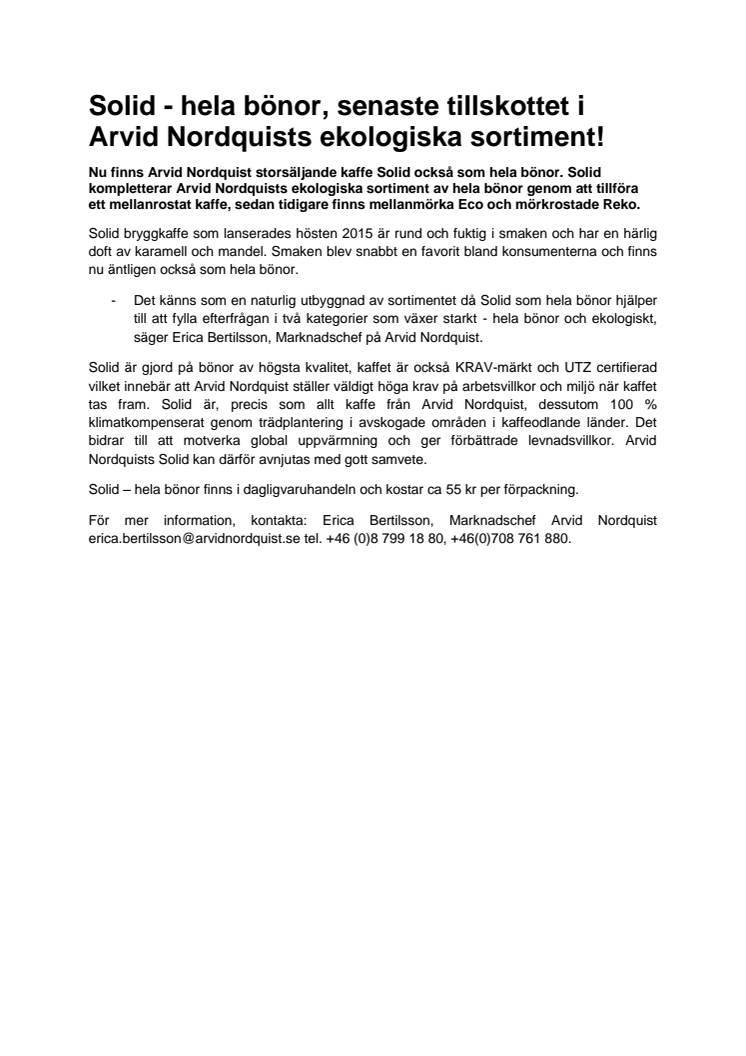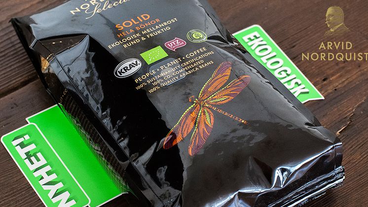 Nu finns Arvid Nordquist storsäljande kaffe Solid också som hela bönor. Solid kompletterar Arvid Nordquists ekologiska sortiment av hela bönor genom att tillföra ett mellanrostat kaffe, sedan tidigare finns mellanmörka Eco och mörkrostade Reko.