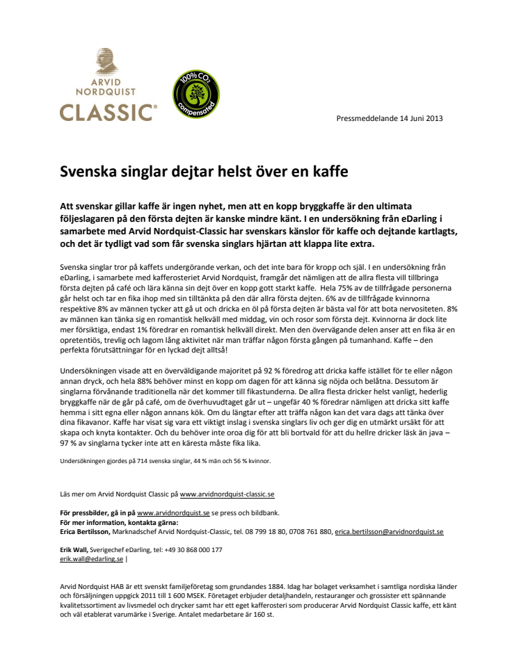 Svenska singlar tror på kaffets undergörande verkan, och det inte bara för kropp och själ. I en undersökning från eDarling, i samarbete med kafferosteriet Arvid Nordquist, framgår det nämligen att de allra flesta vill tillbringa första dejten på café och lära känna sin dejt över en kopp gott starkt kaffe. Hela 75% av de tillfrågade personerna går helst och tar en fika ihop med sin tilltänkta på den där allra första dejten. 6% av de tillfrågade kvinnorna respektive 8% av männen tycker att gå ut och dricka en öl på första dejten är bästa val för att bota nervositeten. 8% av männen kan tänka sig en romantisk helkväll med middag, vin och rosor som första dejt. Kvinnorna är dock lite mer försiktiga, endast 1% föredrar en romantisk helkväll direkt. Men den övervägande delen anser att en fika är en opretentiös, trevlig och lagom lång aktivitet när man träffar någon första gången på tumanhand. Kaffe – den perfekta förutsättningar för en lyckad dejt alltså!