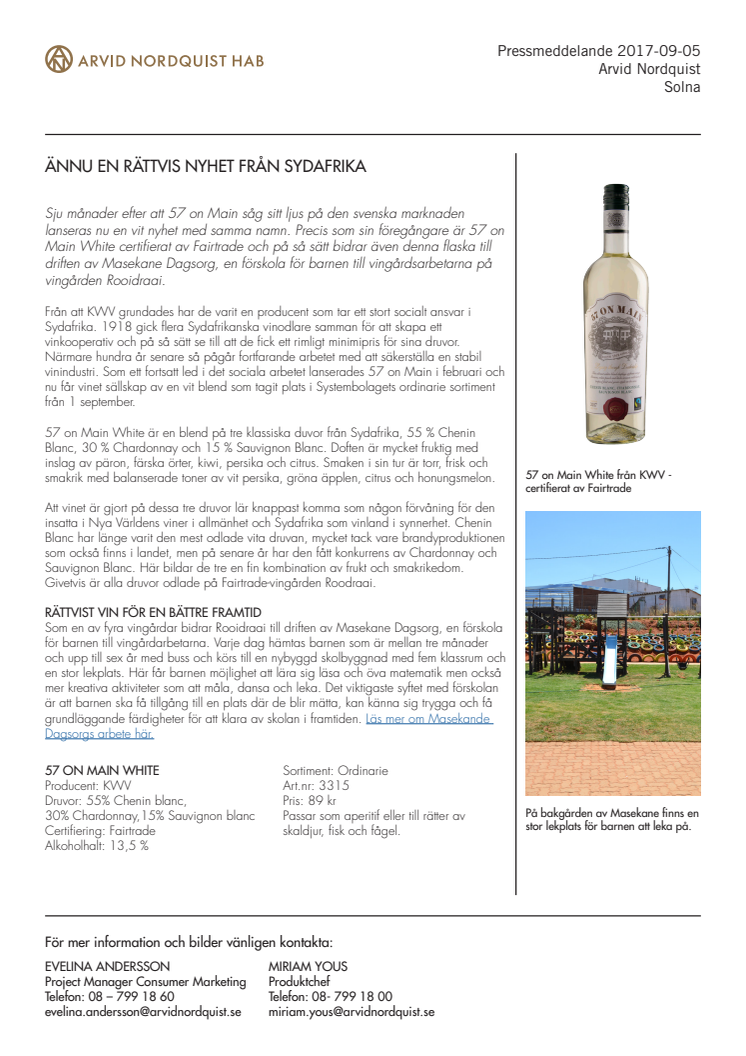 Sju månader efter att 57 on Main såg sitt ljus på den svenska marknaden lanseras nu en vit nyhet med samma namn. Precis som sin föregångare är 57 on Main White certifierat av Fairtrade och på så sätt bidrar även denna flaska till driften av Masekane Dagsorg, en förskola för barnen till vingårdsarbetarna på vingården Rooidraai.