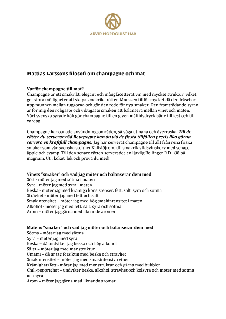 Kocken Mattias Larsson har tillsammans med Bollinger Champagne utvecklat ett matkoncept speciellt framtaget för att möta Bollingers smakpalett. Eventet "Aktiv matlagning med Bollinger i fokus" gick av stapeln 4/3-14 där deltagarna fick laga en fyrarätters-middag tillsammans med Mattias som samtidigt delade med sig av sin filosofi kring varför champagne har en given plats genom en måltid.