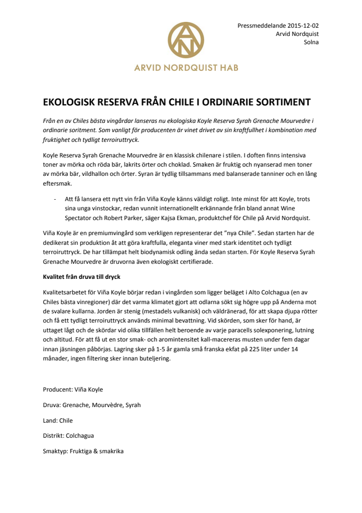 Från en av Chiles bästa vingårdar lanseras nu ekologiska Koyle Reserva Syrah Grenache Mourvedre i ordinarie soritment. Som vanligt för producenten är vinet drivet av sin kraftfullhet i kombination med fruktighet och tydligt terroiruttryck.