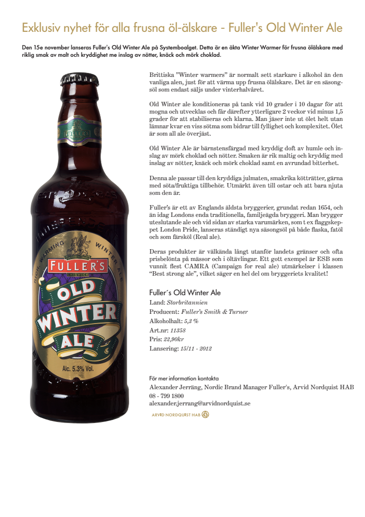 Den 15e november lanseras Fuller's Old Winter Ale på Systemboalget. Detta är en äkta Winter Warmer för frusna ölälskare med riklig smak av malt och kryddighet me inslag av nötter, knäck och mörk choklad.