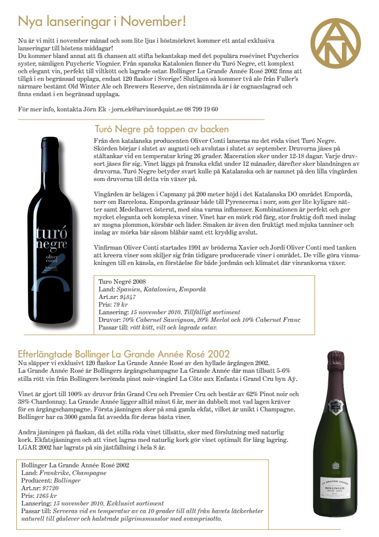 Nu är vi mitt i november månad och som lite ljus i höstmörkret kommer ett antal exklusiva lanseringar till höstens middagar. BLand annat kommer franska Puycheric Viognier och från Spanien kommer Turó Negre. Bollinger La Grande Année Rosé 2002 finns att tillgå i en begränsad upplaga. Slutligen så kommer Fuller's Old Winter Ale och Brewers Reserve.
