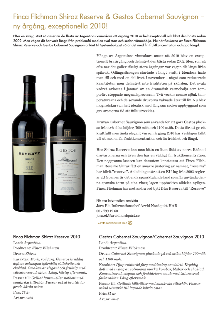 Efter en svajig start så anser nu de flesta av Argentinas vinmakare att årgång 2010 är helt exeptionell och klart den bästa sedan 2002. Men vägen dit har varit långt ifrån problemfri med en sval start och sedan värmebölja. Nu när flaskorna av Finca Flichman Shiraz Reserve och Gestos Cabernet Sauvignon anlänt till Systembolaget så är det med fin fruktkoncentration och god längd.
