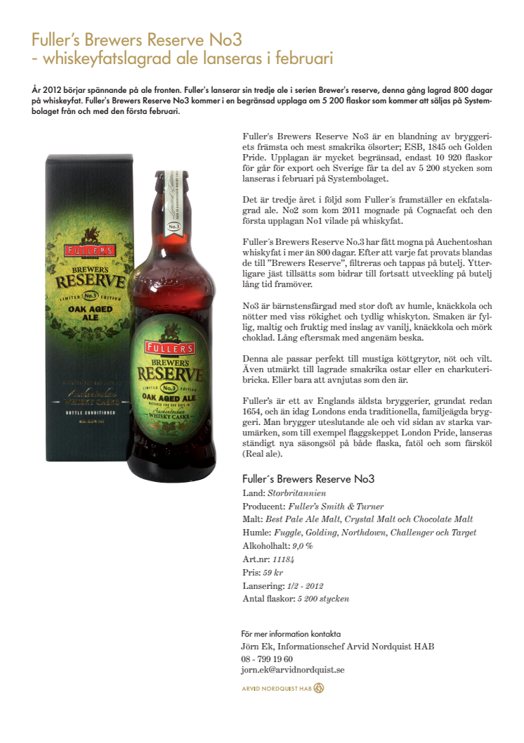 År 2012 börjar spännande på ale fronten. Fuller's lanserar sin tredje ale i serien Brewer's reserve, denna gång lagrad 800 dagar på whiskeyfat. Fuller's Brewers Reserve No3 kommer i en begränsad upplaga om 5 200 flaskor som kommer att säljas på Systembolaget från och med den första februari.