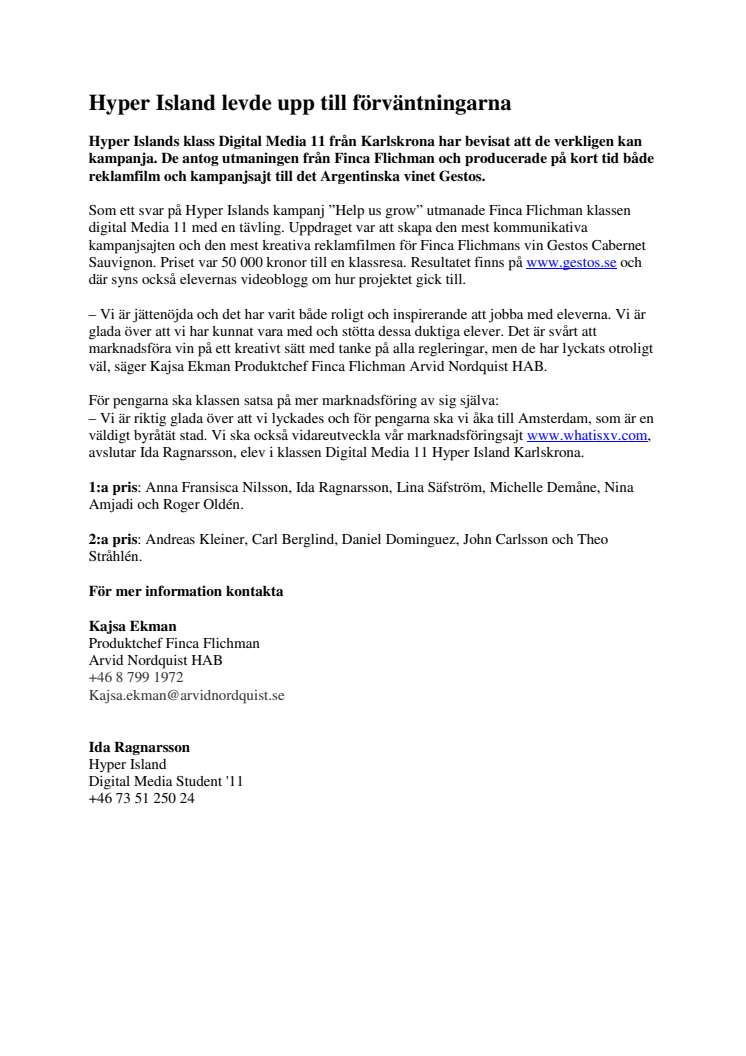 Hyper Islands klass Digital Media 11 från Karlskrona har bevisat att de verkligen kan kampanja. De antog utmaningen från Finca Flichman och producerade på kort tid både reklamfilm och kampanjsajt till det Argentinska vinet Gestos.