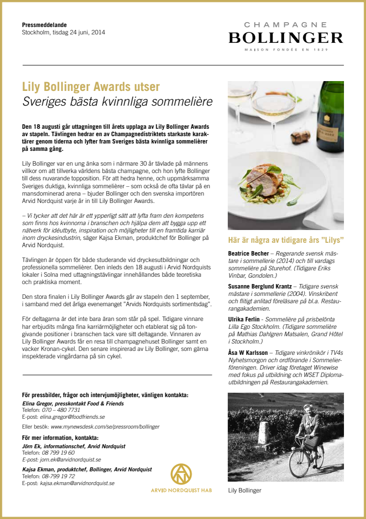 Den 18 augusti går uttagningen till årets upplaga av Lily Bollinger Awards av stapeln. Tävlingen hedrar en av Champagnedistriktets starkaste karaktärer och lyfter fram Sveriges bästa kvinnliga sommelièrer. Uttagningen är öppen för studerande vid dryckesutbildningar och professionella sommelièrer och sker hos Arvid Nordquist i Solna. Uttagningen innehåller både teoretiska och praktiska moment.