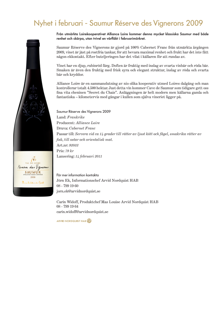 Nyhet i februari - Saumur Réserve des Vignerons 2009