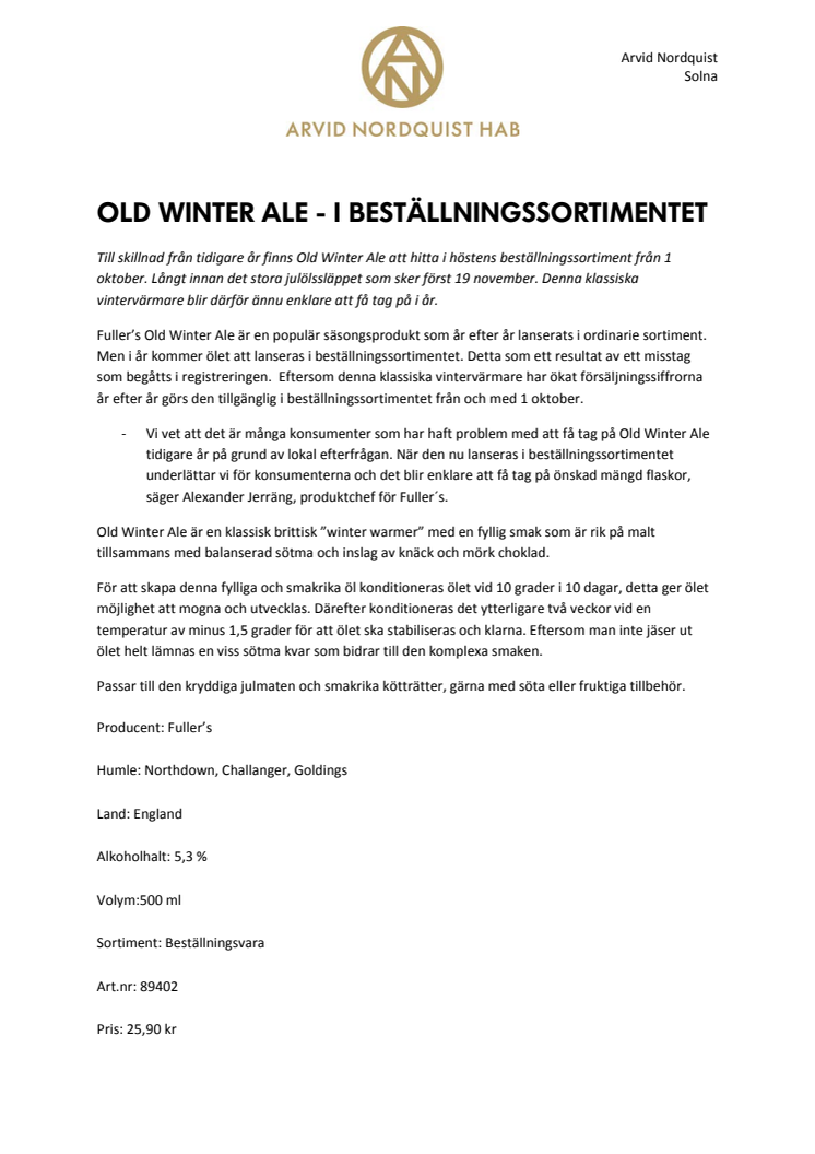 Till skillnad från tidigare år finns Old Winter Ale att hitta i höstens beställningssortiment från 1 oktober. Långt innan det stora julölssläppet som sker först 19 november. Denna klassiska vintervärmare blir därför ännu enklare att få tag på i år.