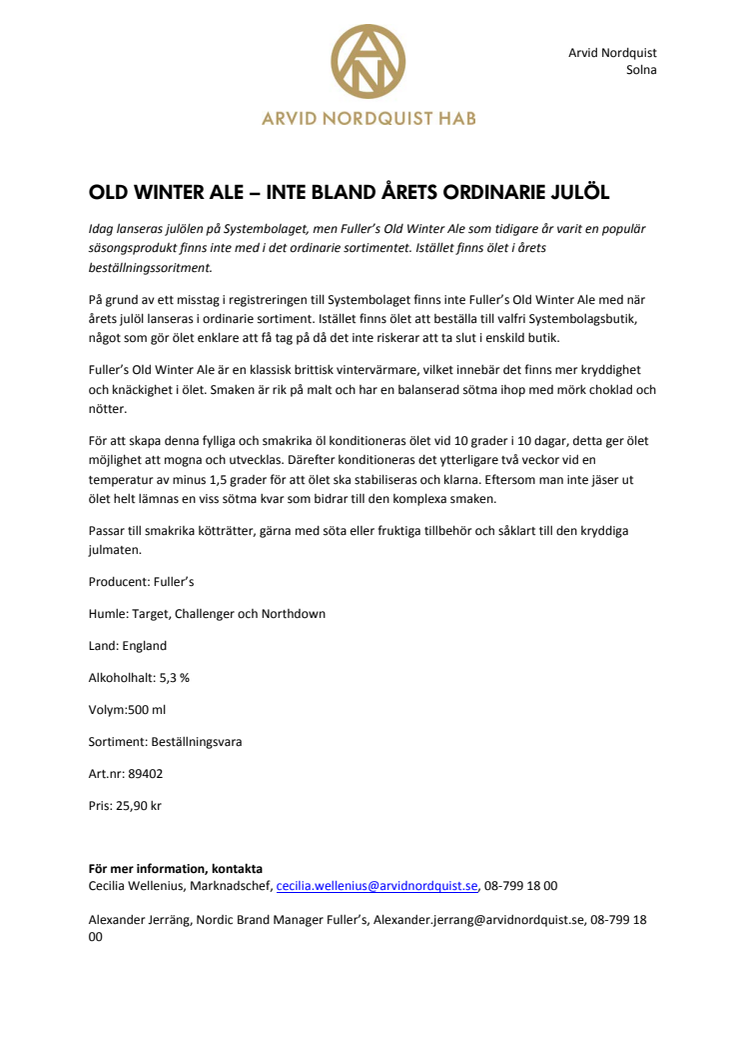 Nu har julölen lanserats på Systembolaget, men Fuller’s Old Winter Ale som tidigare år varit en populär säsongsprodukt finns inte med i det ordinarie sortimentet. Istället finns ölet i årets beställningssoritment.