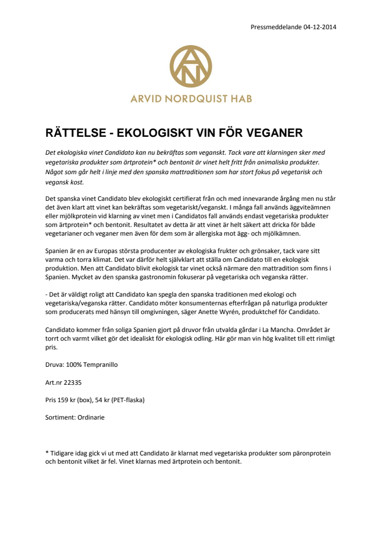 Det ekologiska vinet Candidato kan nu bekräftas som veganskt. Tack vare att klarningen sker med vegetariska produkter som ärtprotein* och bentonit är vinet helt fritt från animaliska produkter. Något som går helt i linje med den spanska mattraditionen som har stort fokus på vegetarisk och vegansk kost.