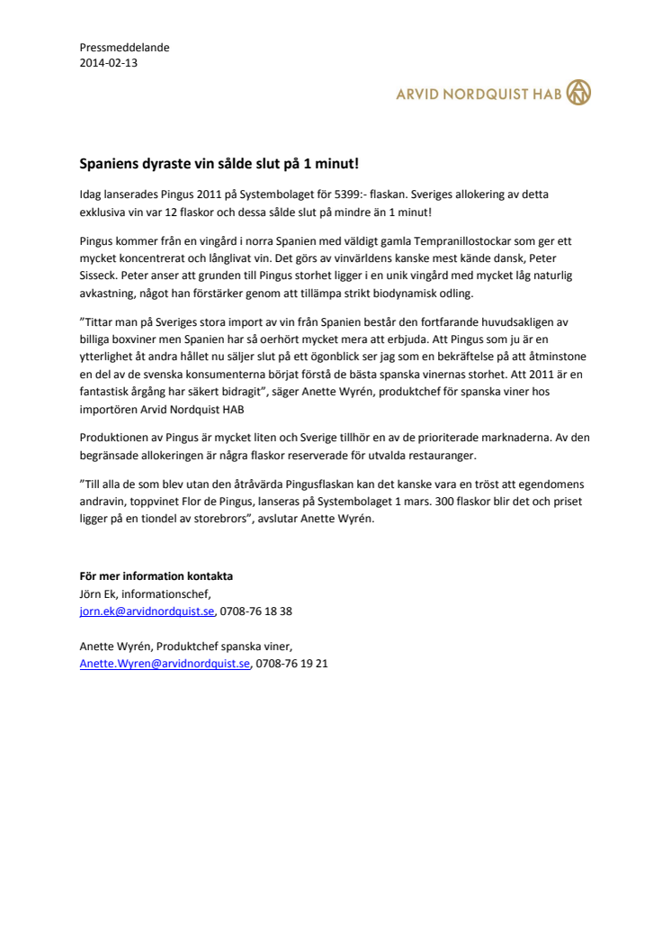 Idag lanserades Pingus 2011 på Systembolaget för 5399:- flaskan. Sveriges allokering av detta exklusiva vin var 12 flaskor och dessa sålde slut på mindre än 1 minut! Bakom Pingus står kultproducenten Peter Sisseck.