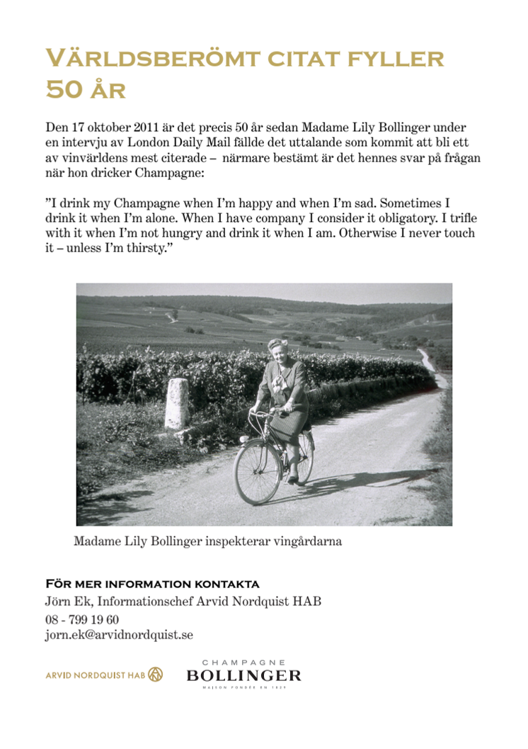 Den 17 oktober 2011 är det precis 50 år sedan Madame Lily Bollinger under en intervju av London Daily Mail fällde det uttalande som kommit att bli ett av vinvärldens mest citerade – närmare bestämt är det hennes svar på frågan när hon dricker Champagne: ”I drink my Champagne when I’m...